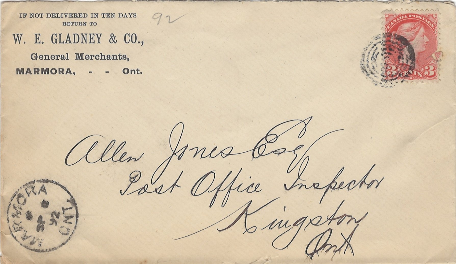 The property has changed hands a number of times: T.P. Pearce first transferred it to his company known as the "Cobourg, Peterborough and Marmora Railway" which was his company running ore from Blairton to Cobourg. That company, in turn, sold to Alexander W. Carscallen, who then sold to B.C. Hubbell, but later bought it back again with the assistance of William Edward Gladney. So was established the first home of the Gladney & Carscallen General Store and tailor shop. Eventually, Carscallen gave W.E. Gladney a quit claim deed. Upon his death, on Sept. 1, 1902, the property devolved to his sons, Edward and Clarence Gladney.