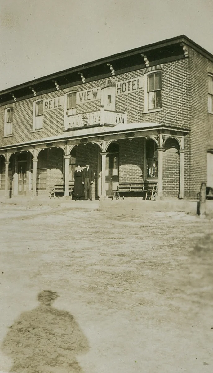 THE HOTEL was built with the accommodation and comfort of the weary travellers in mind and there were many of them at that time. A large dining room, a sitting room, a stand up bar, a spacious kitchen, a laundry room and woodshed at the rear, its abundant dry hardwood feeding two large wood- burning stoves in the cold months. The open stairway, with the polished hardwood railing, offered an invitation to the comfortable well maintained bedrooms upstairs. The apartments over the kitchen and utility rooms were usually occupied by railroaders. The Bellview Hotel was as modern as any of that time. The manager and good cook, as well as the dedicated staff, were responsible for the reputation that attracted many people to the Bellview Hotel.