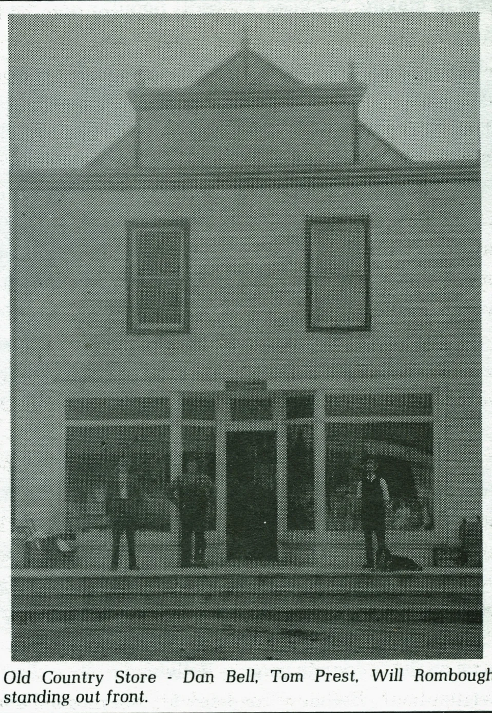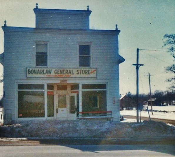 The Old Bonarlaw General Store. Judy Moore, daughter of George and Minnie Moore wrote: George and Minnie Moore purchased the old store from Bill Barlow and continued to run it and the post office until the highway bought it out and they had to build the new store across the road from the Bell house and beside the old hotel.