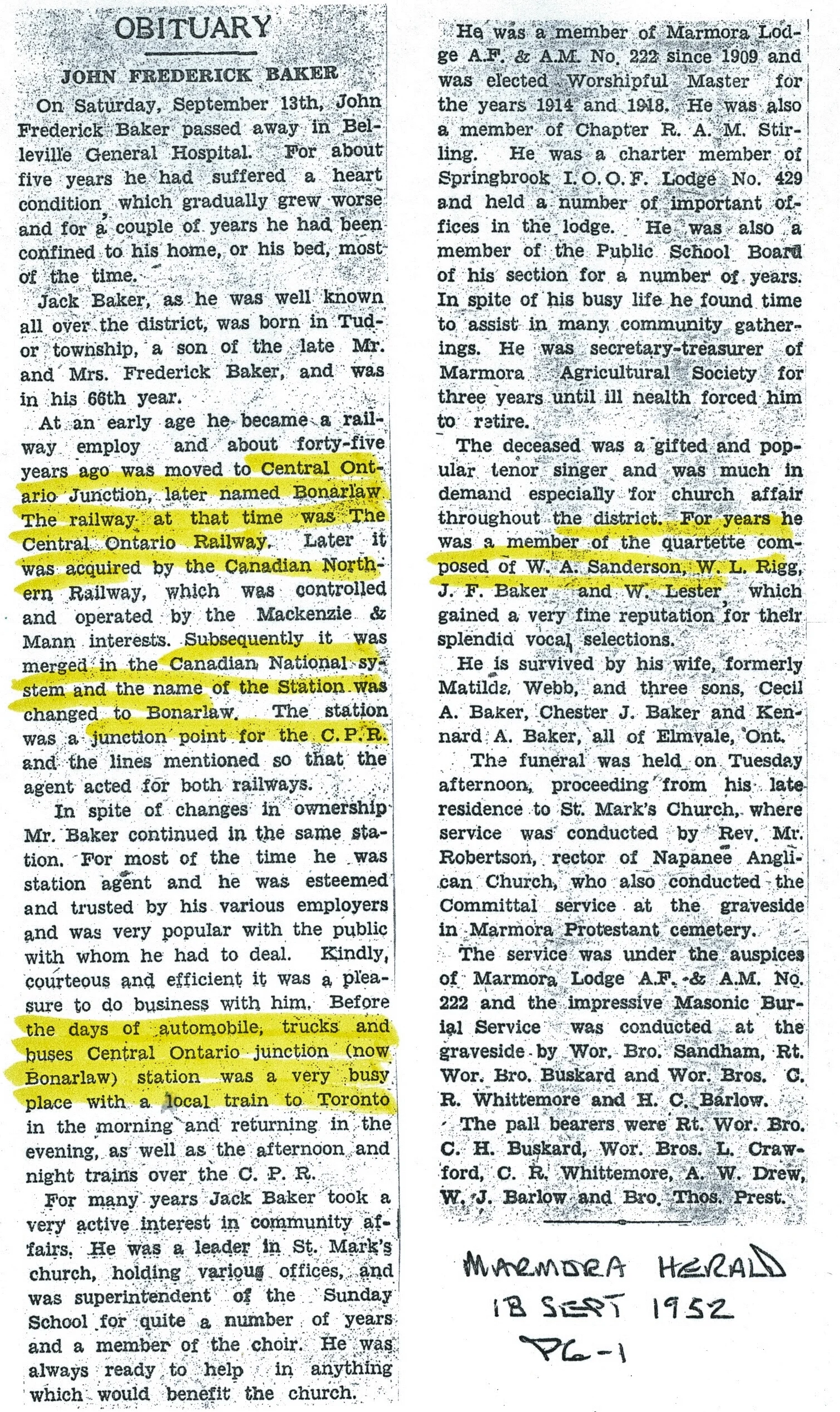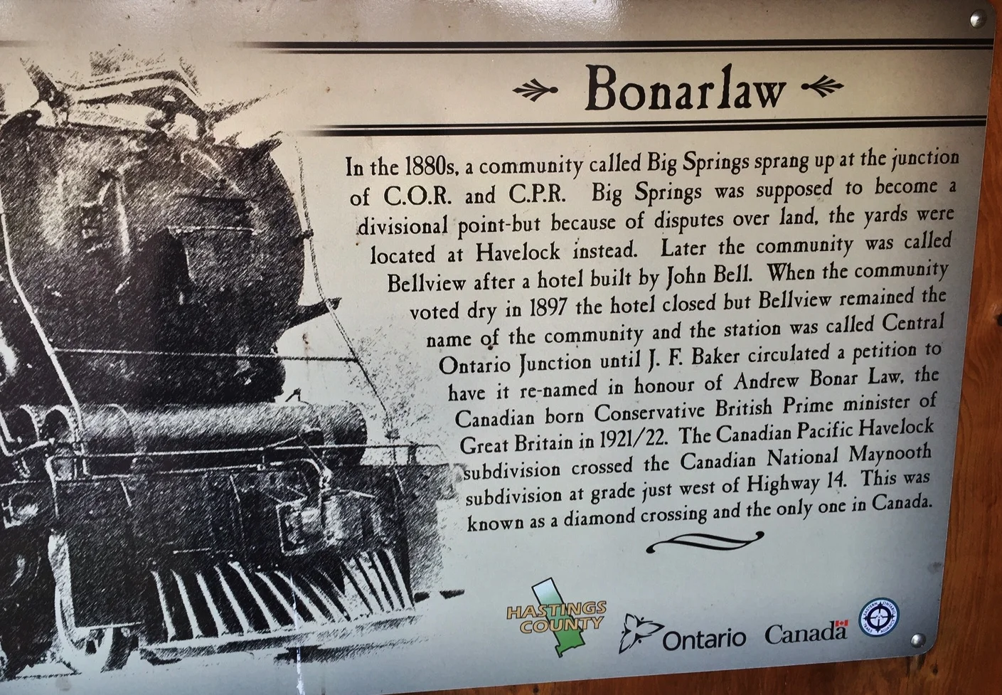 Bonarlaw's first name was Central Ontario Junction. The railway was first acquired by the Canadian Northern Railway, and was known as Big Springs, for the clear waters that fed Trout Creek, and for the water supply cosidered by locomotive engineers to be a mjor factor in deciding where to stop. The Big Springs also supplied a cheese factory, which, in 1898, was running full force under the management of Charles Linn, previously by James McComb., according to the Marmora Herald of May 12, of that year. There was also a cheese factory there that ran under the name "Maple Leaf", according to the Ontario Archives. The community was also known as Bell View (named after Mr. Bell) and subsequently merged into the Canadian National system, when the name changed to Bonarlaw, named for British Prime Minister Andrew Bonar Law. (Born in New Brunswick, he is the only British Prime Minister to have been born outside the British Isles.)