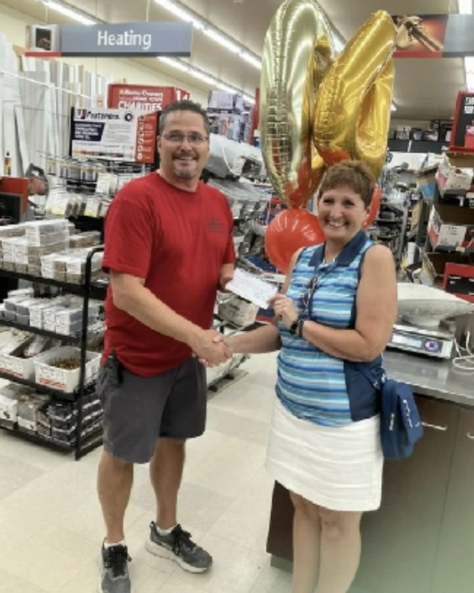 Russ Broadbent celebrating 40 Years of the Marmora HOme Harware by donating $800.00 to Lions President Cynthia Reid (Photo courtesty of “News On 7”