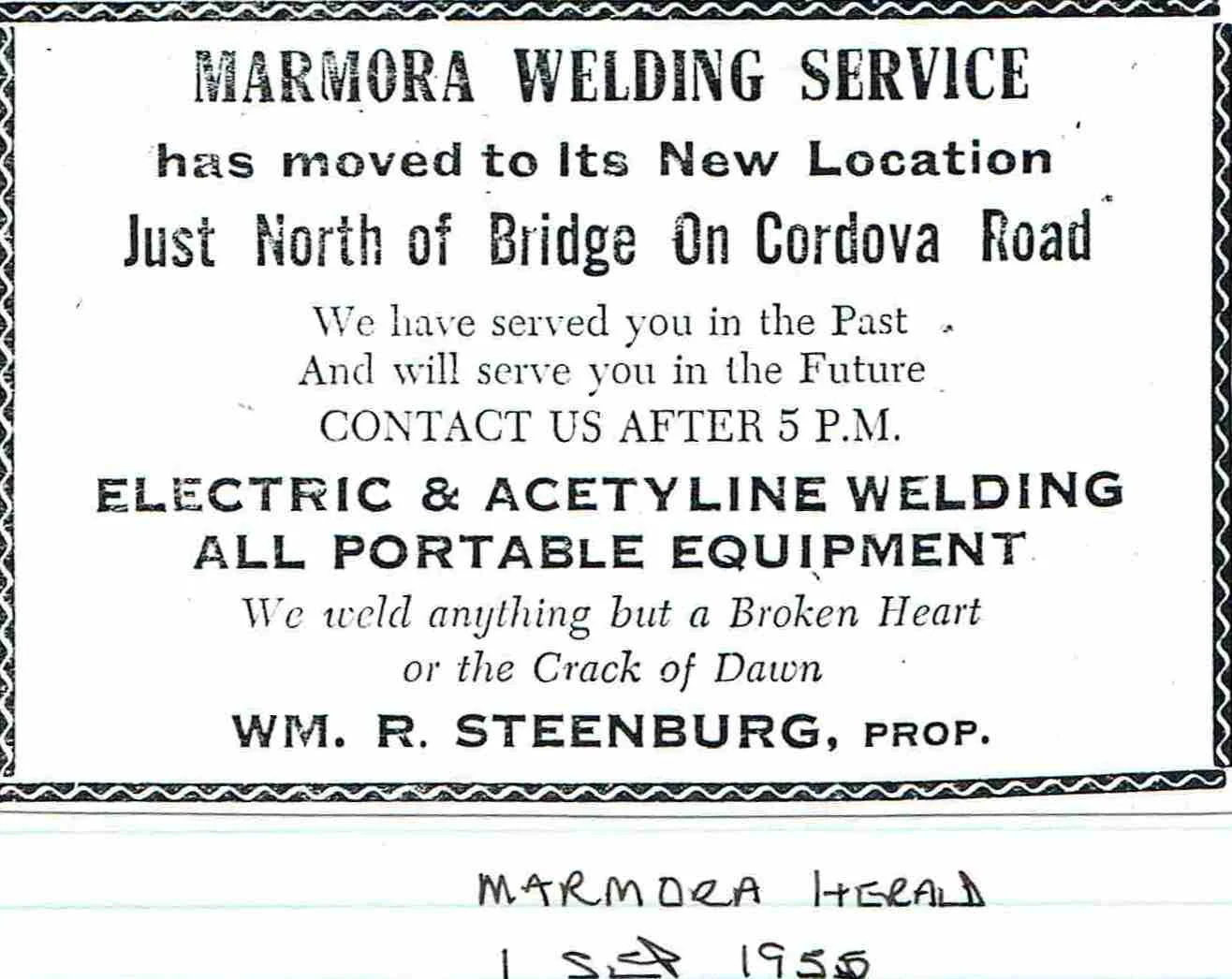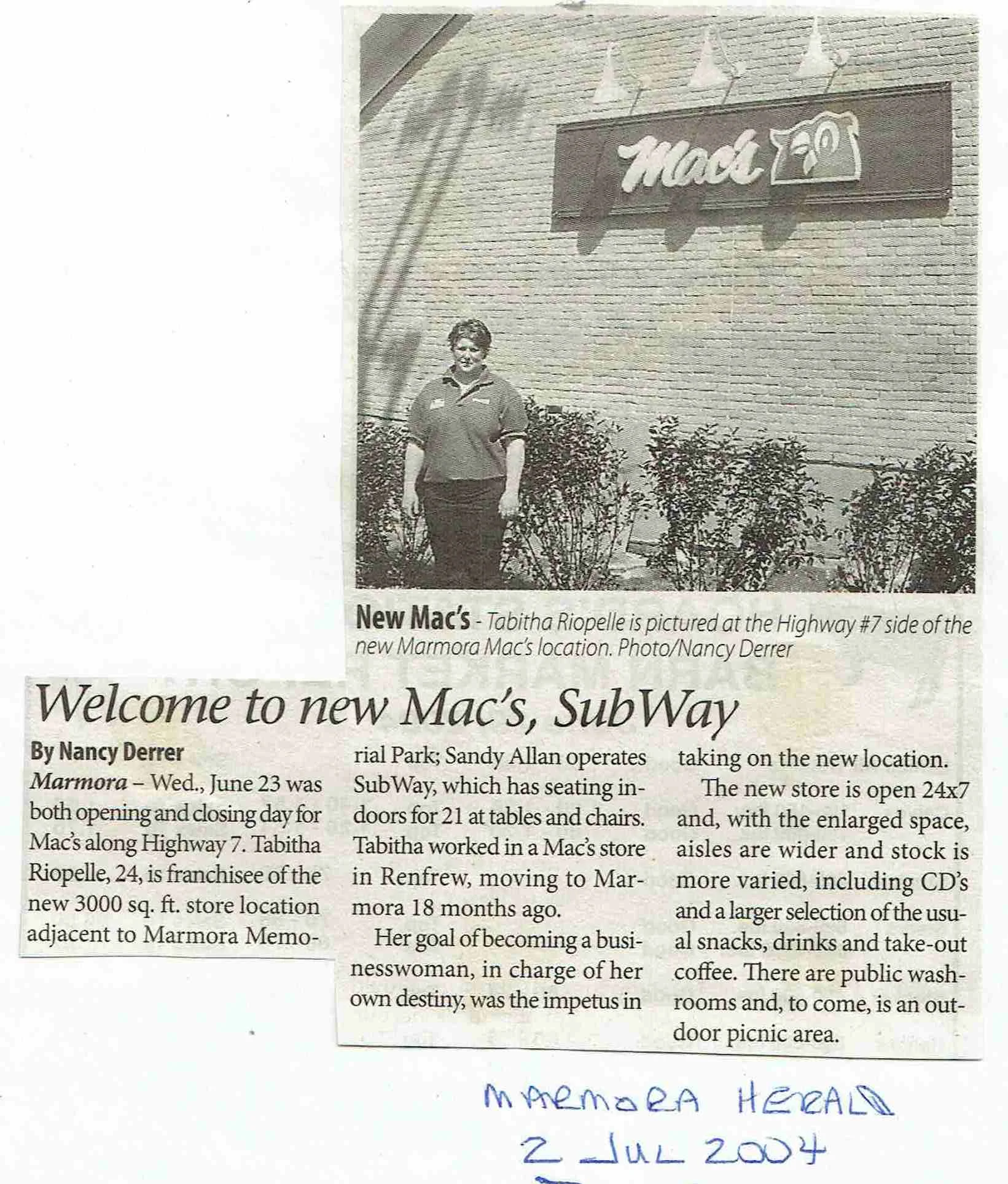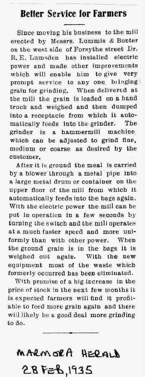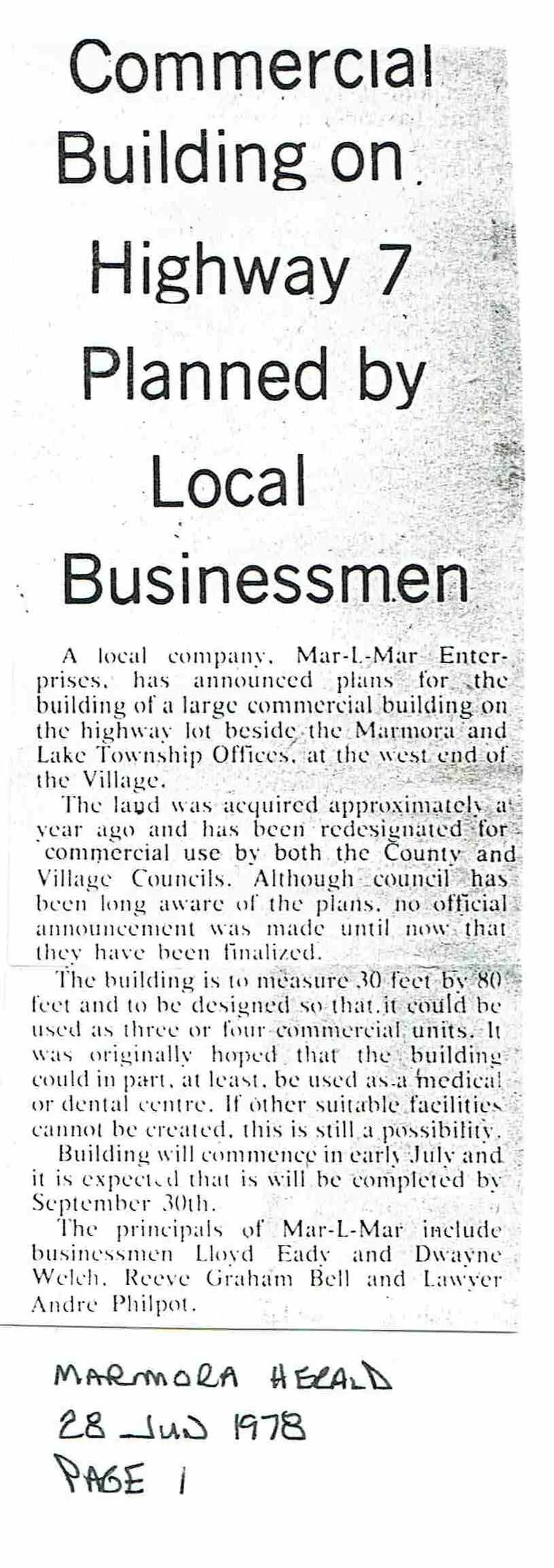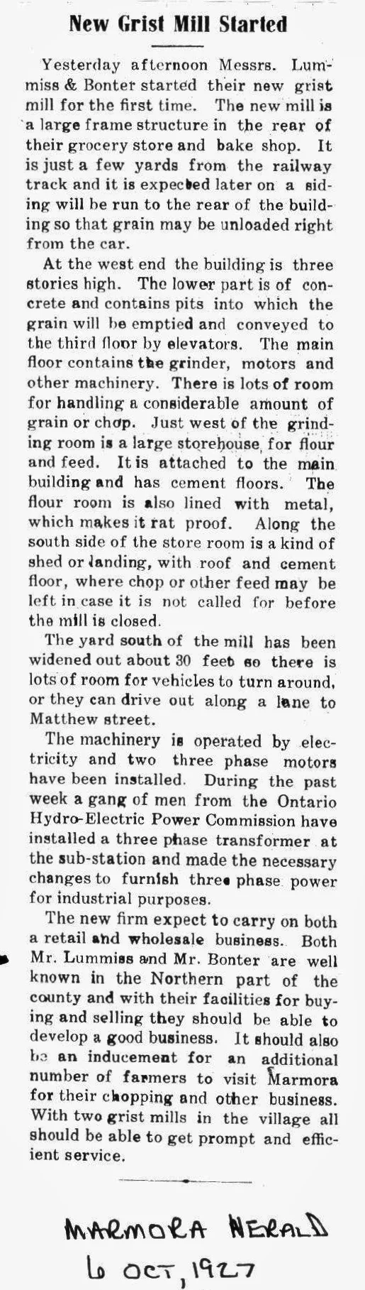 The Marmora Feed Mill, which stood behind Mac's, was originally built in October, 1927 by Charles Lummiss and William Bonter. It had a concrete floor and was lined with metal to make it rat proof. In June of 1927, the Herald wrote:
