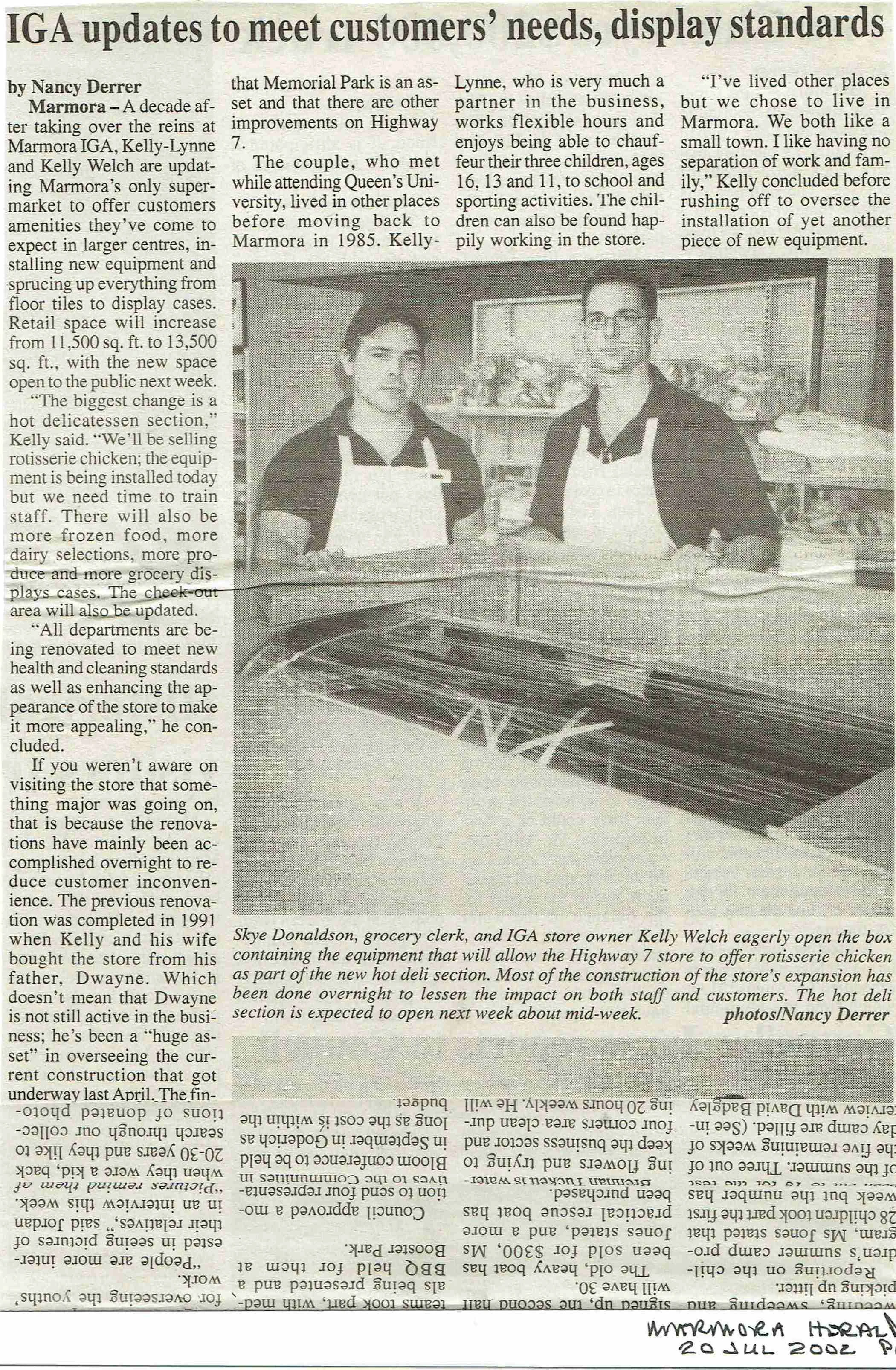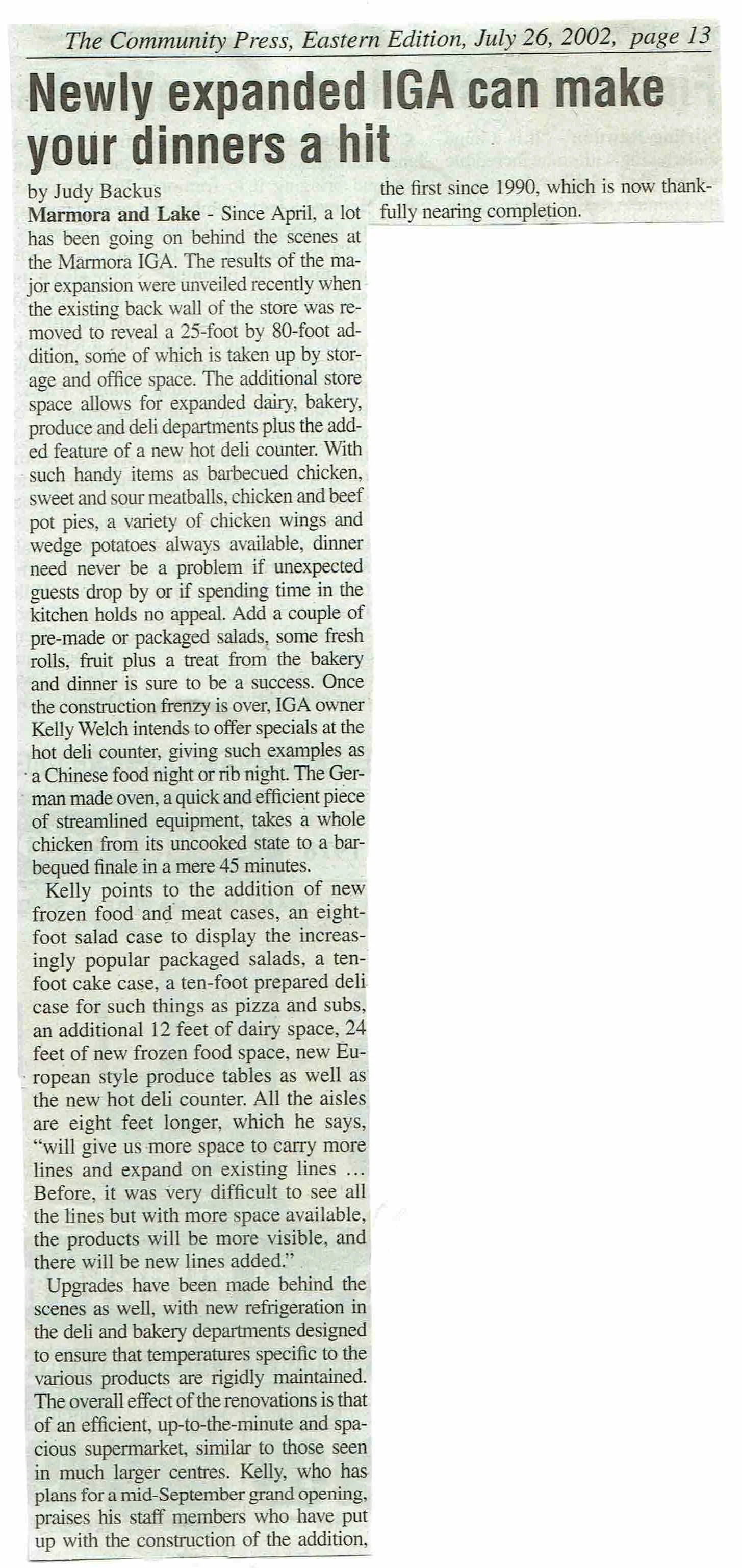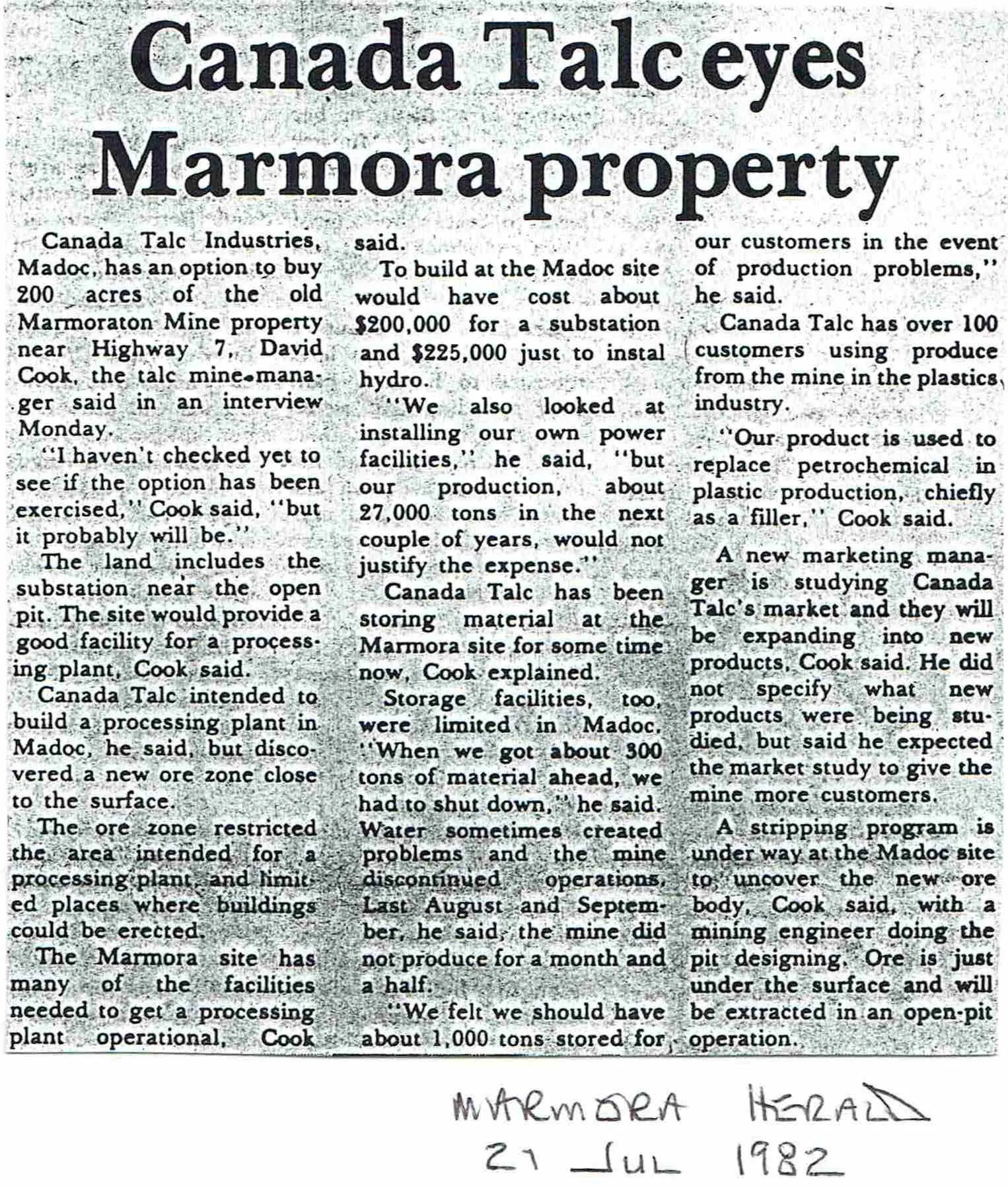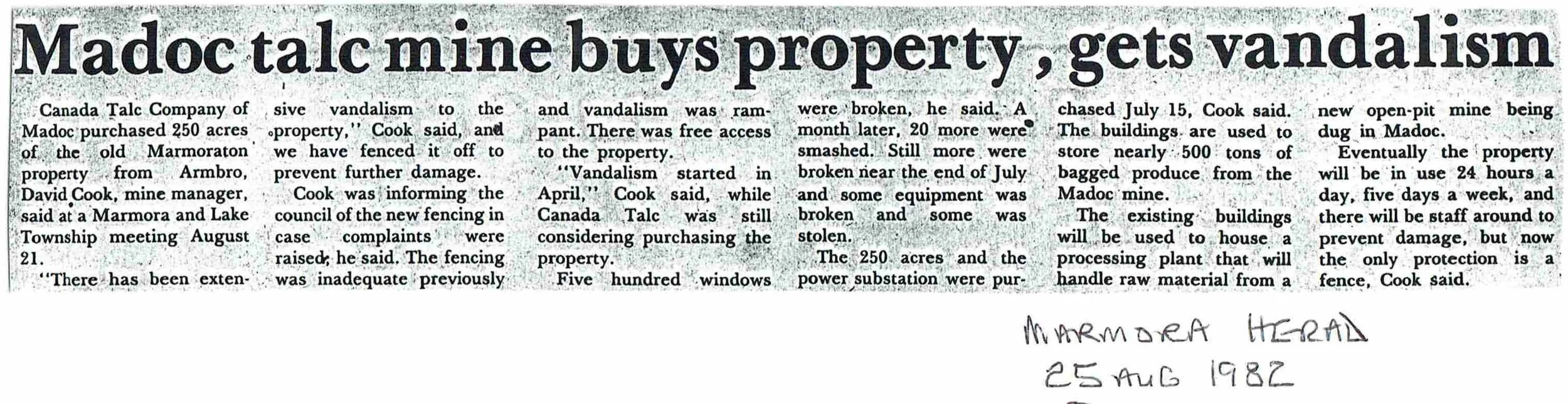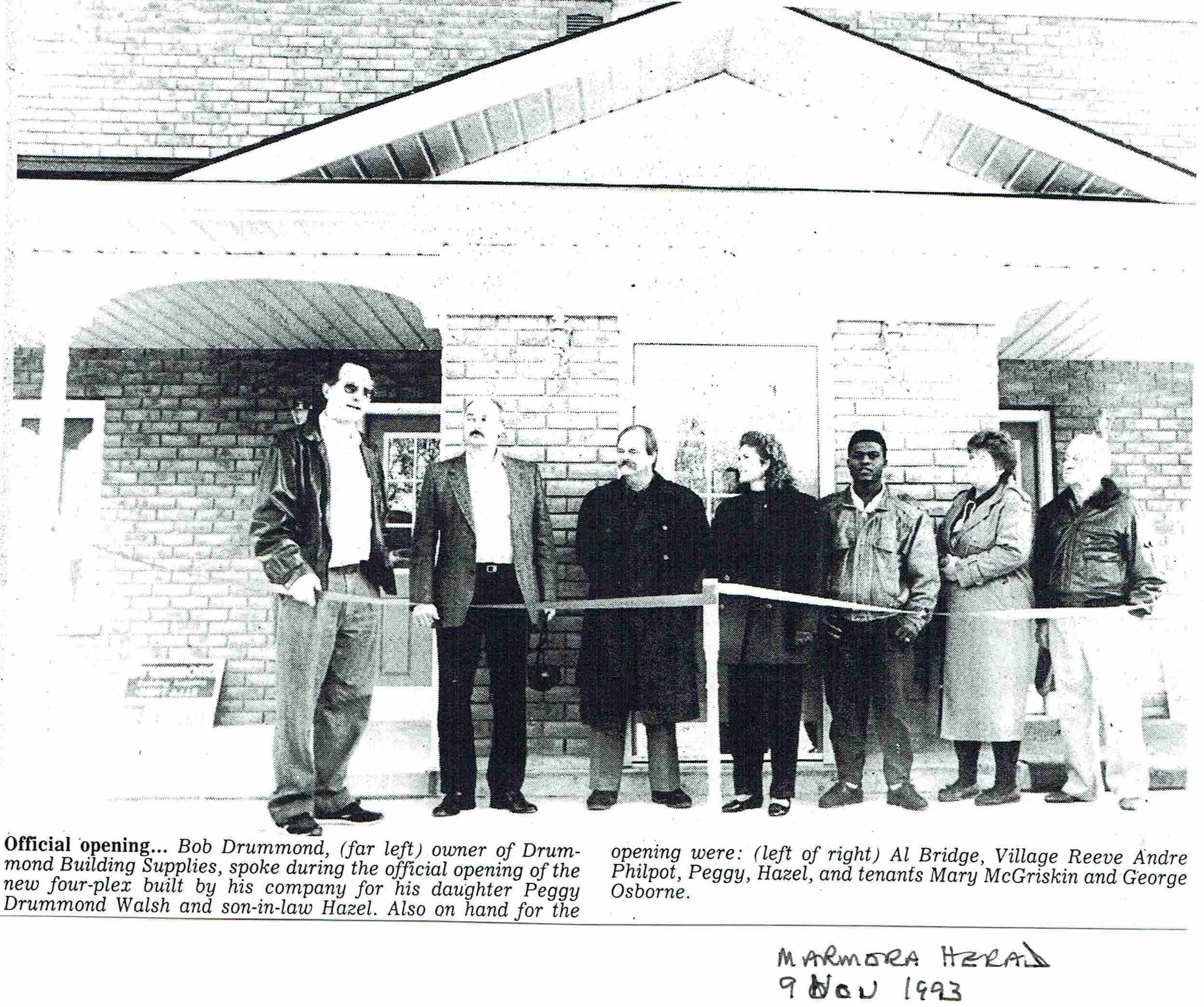 The Marmora Feed Mill, which stood behind Mac's, was originally built in October, 1927 by Charles Lummiss and William Bonter. It had a concrete floor and was lined with metal to make it rat proof. In June of 1927, the Herald wrote: