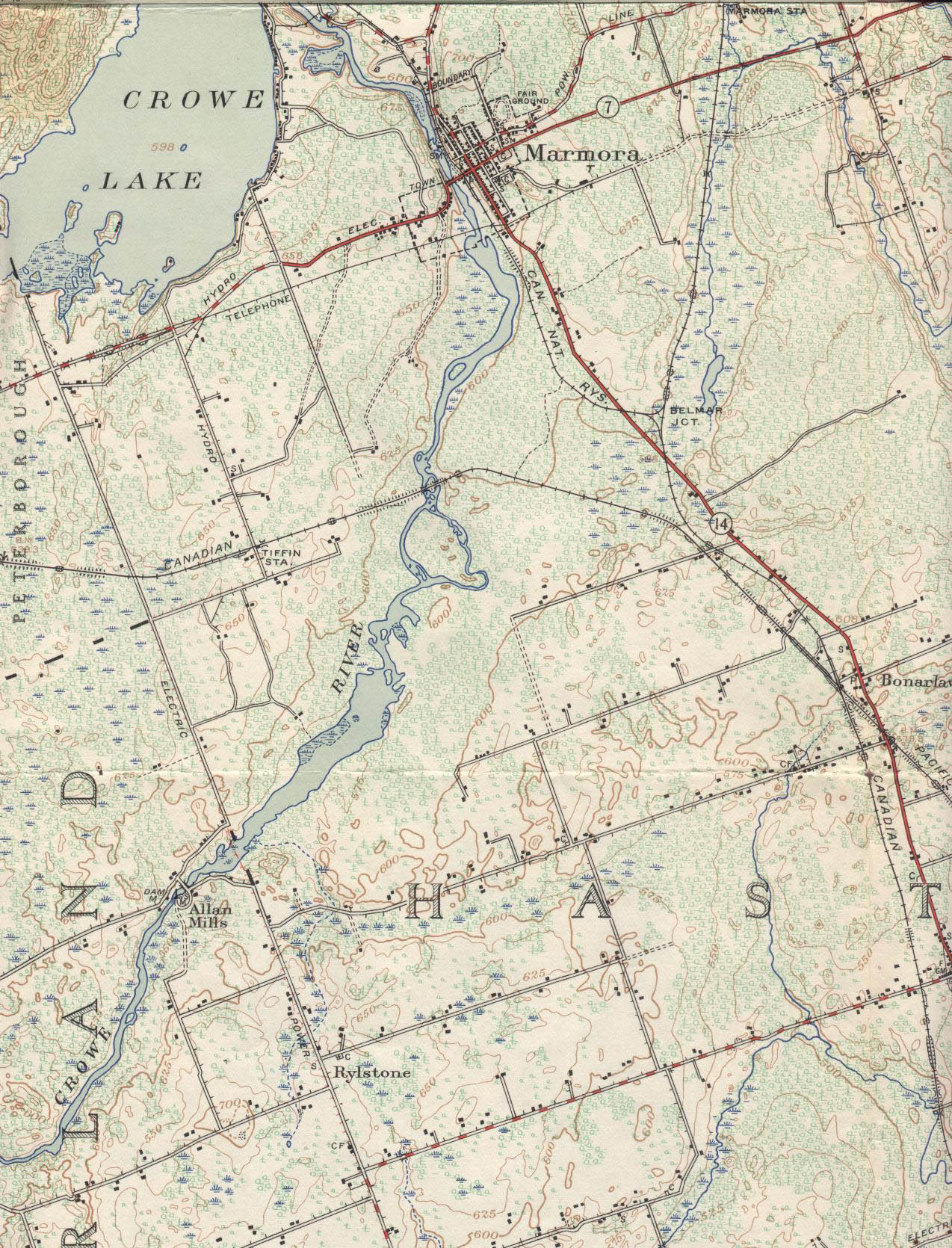 This 1947 map shows the abandoned mines in the Cordova Mines area. The the old rail line from Marmora is also visible.