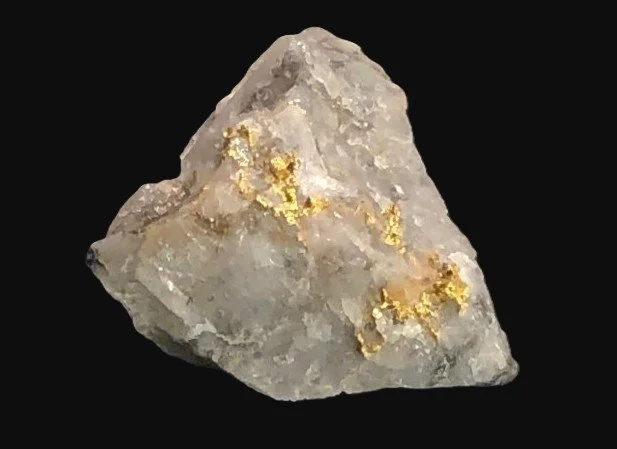 gold in quartz from the original gold mine in deloro, Ontario, discovered in 1868. presented to maurice riddihough, Technical director of deloro stellite (UK) in 1946 during his visit to its parent company, the deloro smelting and refining company in deloro (part of the M.J. O’Brien “empire”)