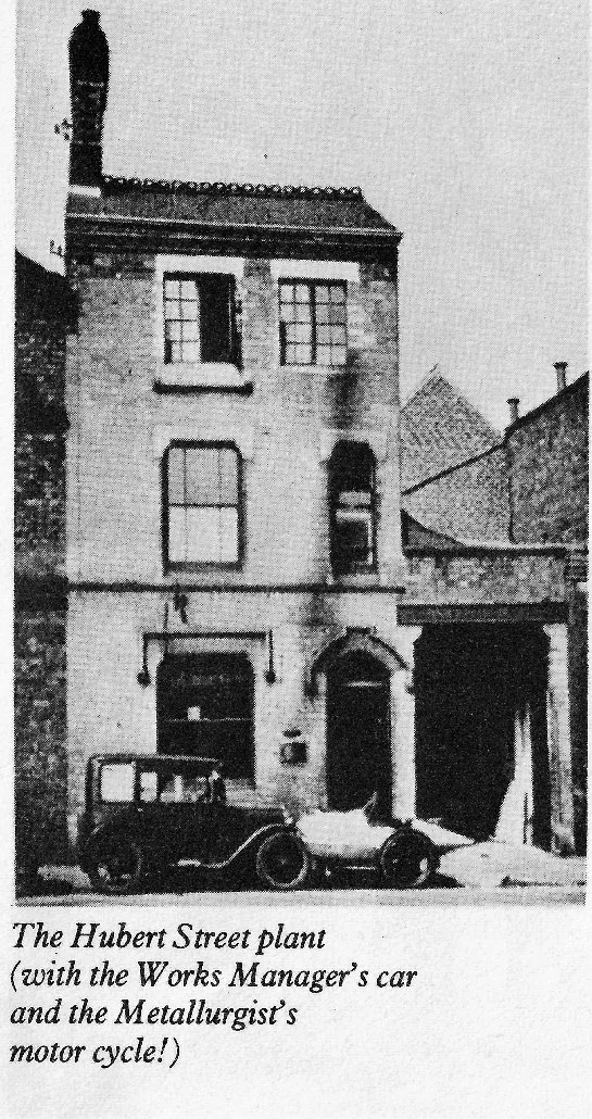 The first, very small, office was opened in Birmingham in 1919 and held 500lbs of Stellite bars and rods shipped from Deloro, Ontario. With a staff of only 3 people it developed machinery to cut and grind the Stellite for a growing group of clients. Sales steadily increased and greater quantities of Stellite were required by businesses such as Fords and a number of companies in Germany. Larger premises and staff soon became essential and in 1924 a 14 year lease was taken on a building in Hubert Street, Birmingham.