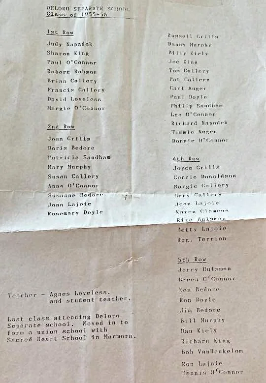 You see, there were two schools, one that was Public and one Separate. I don't understand why they had to have two schools, when we all would have fit just fine into one classroom. It's a real shame that at such a young age and because there were only very few of us that there was fear of the Catholic children losing any faith from their church. As you know, in Marmora, the community had at one point in time shared the church, although it was of Catholic Denomination. And still today, you find that sort of unity among all the churches. But I just can't understand why in Deloro, such a small community, we were separated from the other children.