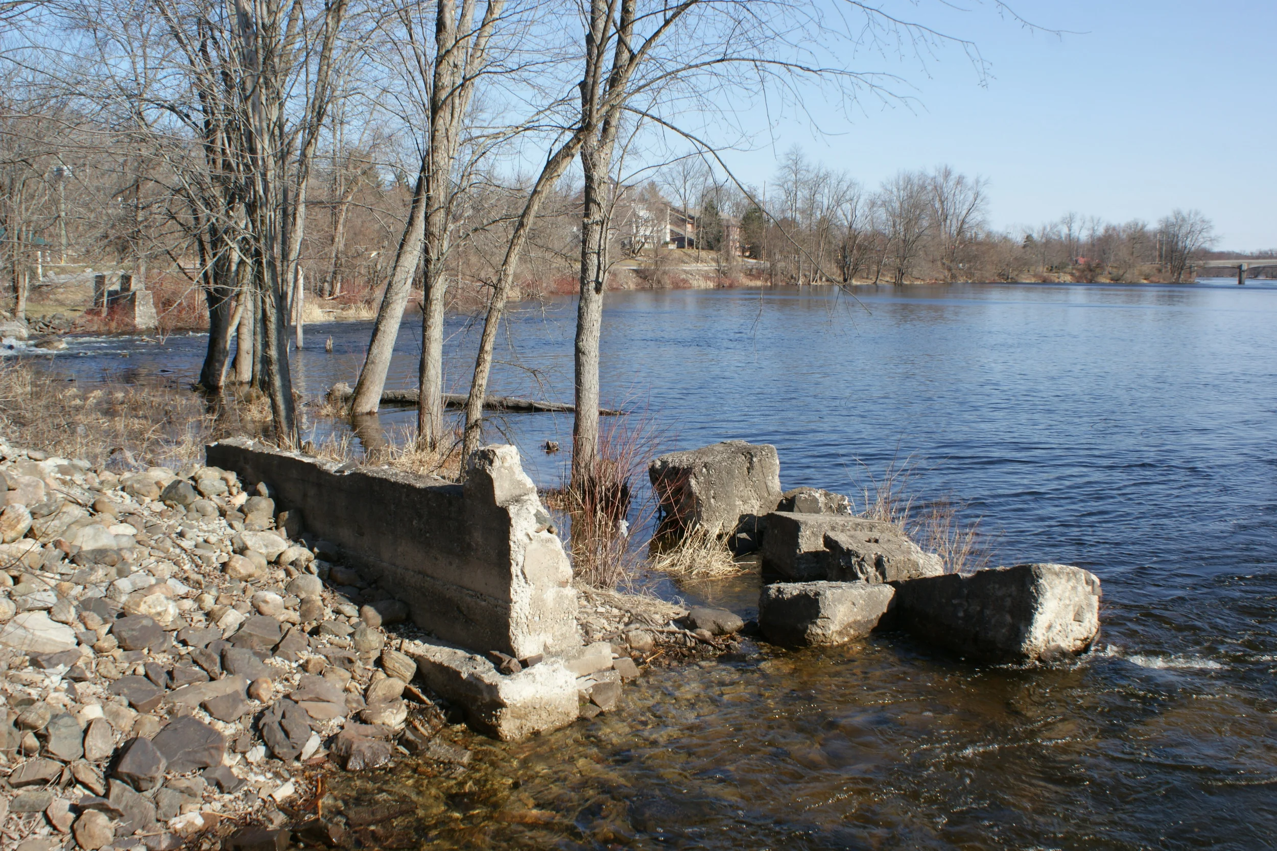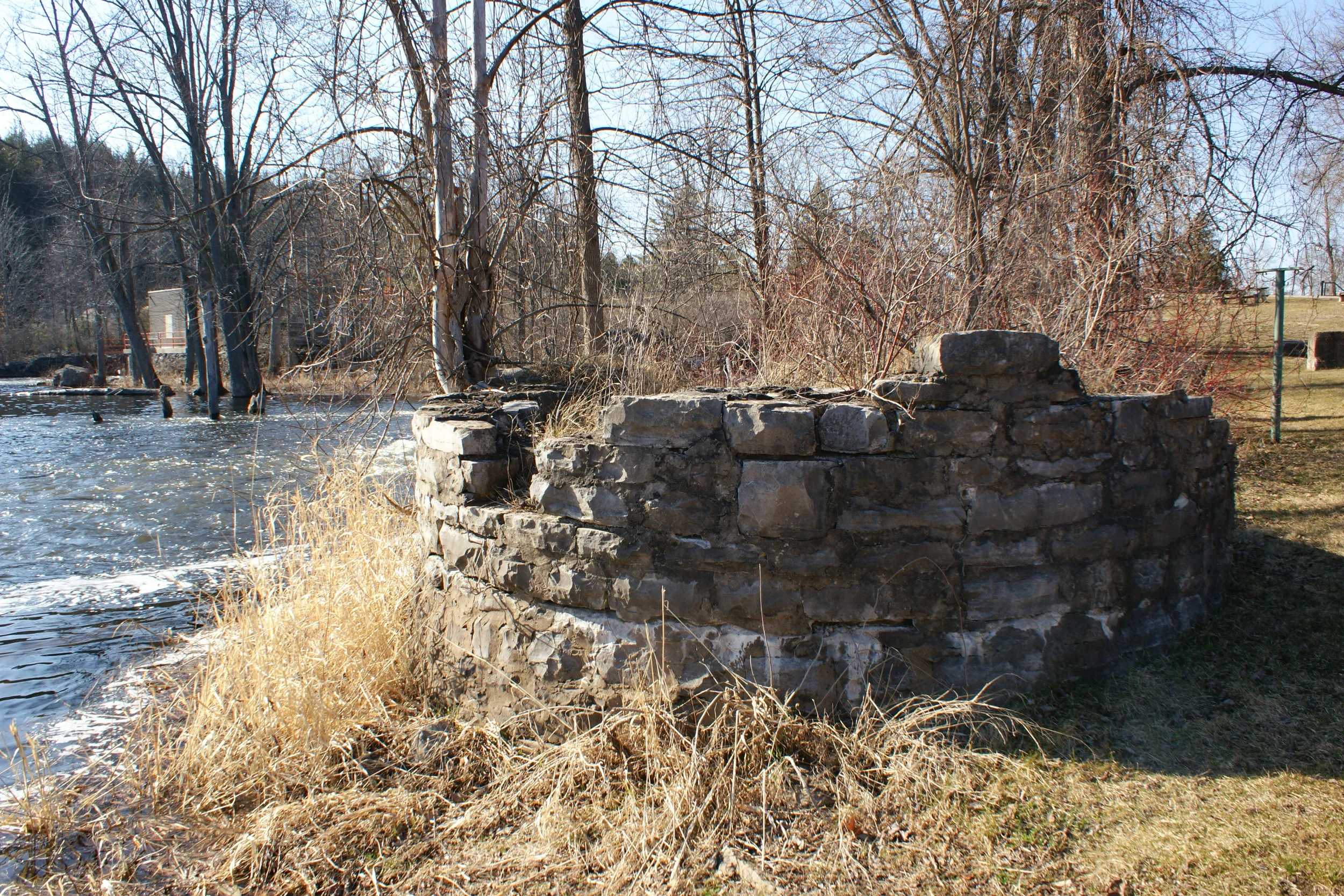 The Pearce Company was the biggest business in town from 1873 until Nov. 30, 1933, when the last of its lands were sold off. All that is left of the vast spread of mill buildings at the dam are pillars and rock foundations that once held up a saw mill, grist mill, woollen mill, hydro generating plant and even a gold processing mill. Here, pictured, is the base of the gigantic sawdust burning chimney, easily visited at the dam.