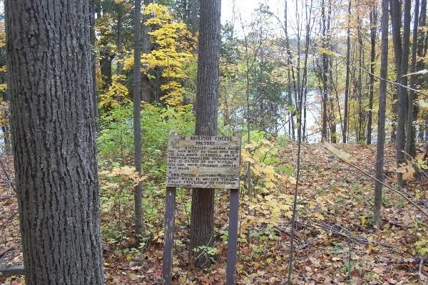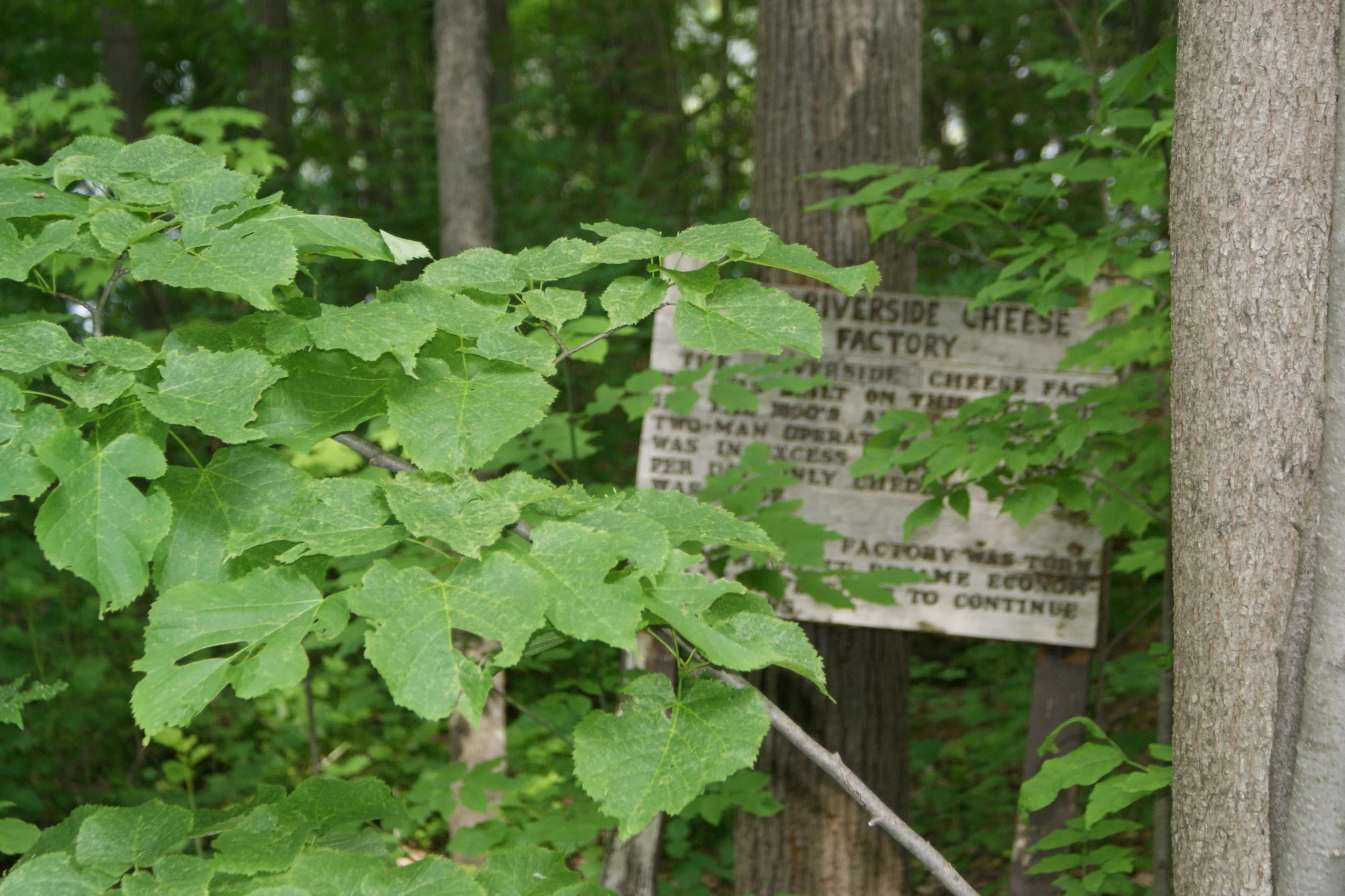 This wooden plaque, located a few steps north of H-way 7,on the west bank of the Crowe River stands in a bed of poison ivy and reads: THE RIVERSIDE CHEESE FACTORY was built on this site during the 1890's. Although only a two man operation, production was in excess of 800 pounds per day. Only cheddar cheese was made.The cheese factory was torn down when it became economically unfeasible to continue operations. (Click here for more)