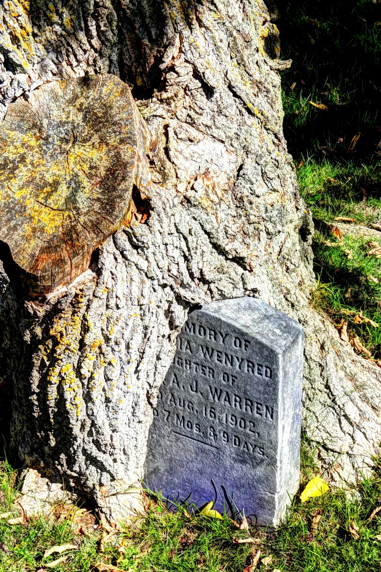 In Memory of Wenyred, daughter of A.G. Warren, Aug 16, 1902 A search for Wenyred Warren turned up nothing. However, using the death date and the age at death, inscribed on the gravestone we see that the person was Aletha Winifred Warren, daughter of James Burton Warren and Annie Taylor.