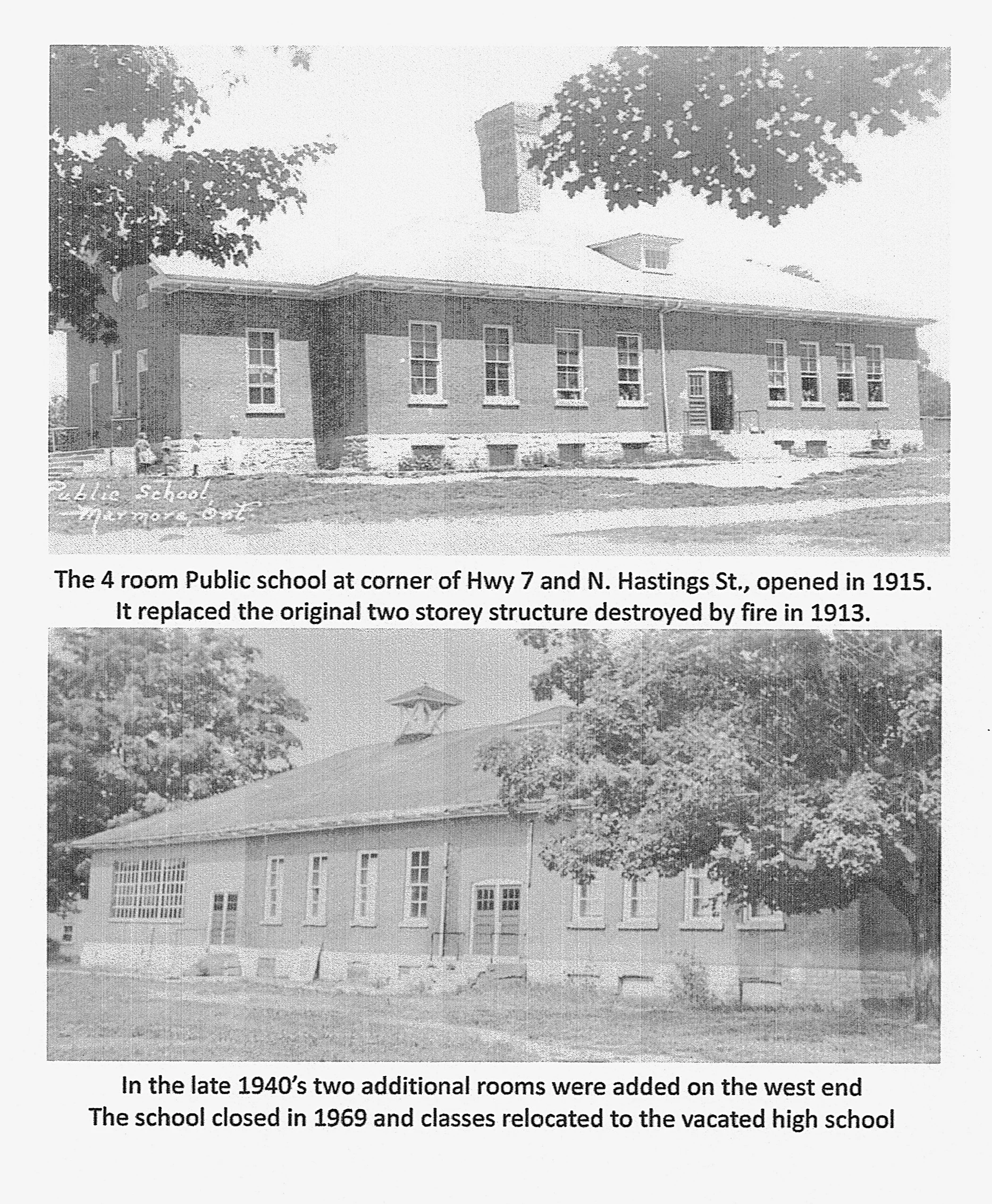 Right after the fire, the Marmora Herald reported " The value of the building together with furniture and equipment was approximately $15,000.00 and there was $7,500.00 covered by insurance. Arrangements were made for accommodations for the various classes as follows: