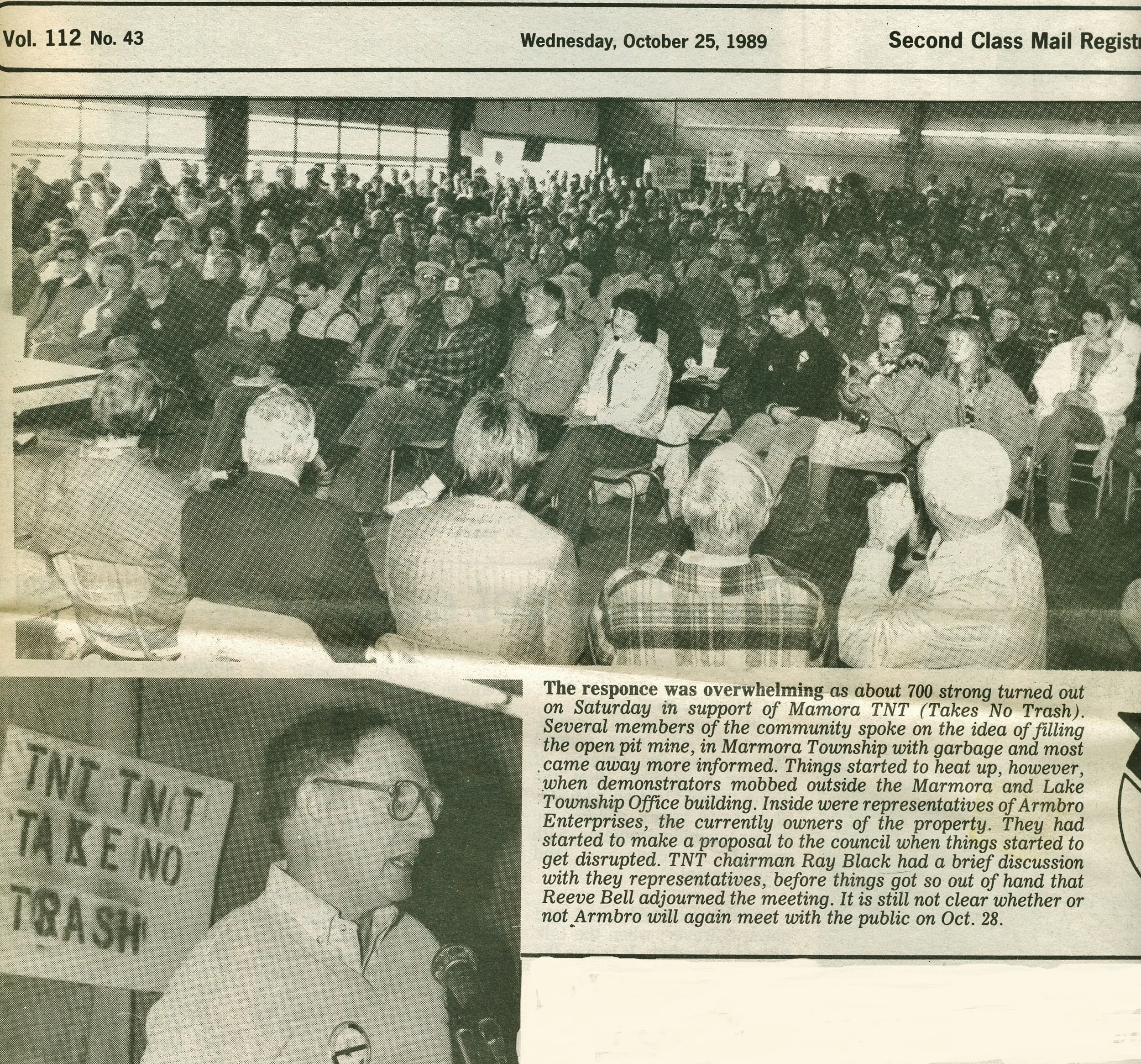 This volunteer Organization has been working diligently since September, 1989 on behalf of the Community and property owners in the Marmora district opposing the proposed landfill garbage dump in the Marmora mine pit. Armbro Enterprises Inc. has made their proposal to Metro Toronto, the Greater Toronto Area and presentation to Marmora & Lake Township Council, Village of Marmora and the Township of Rawdon.