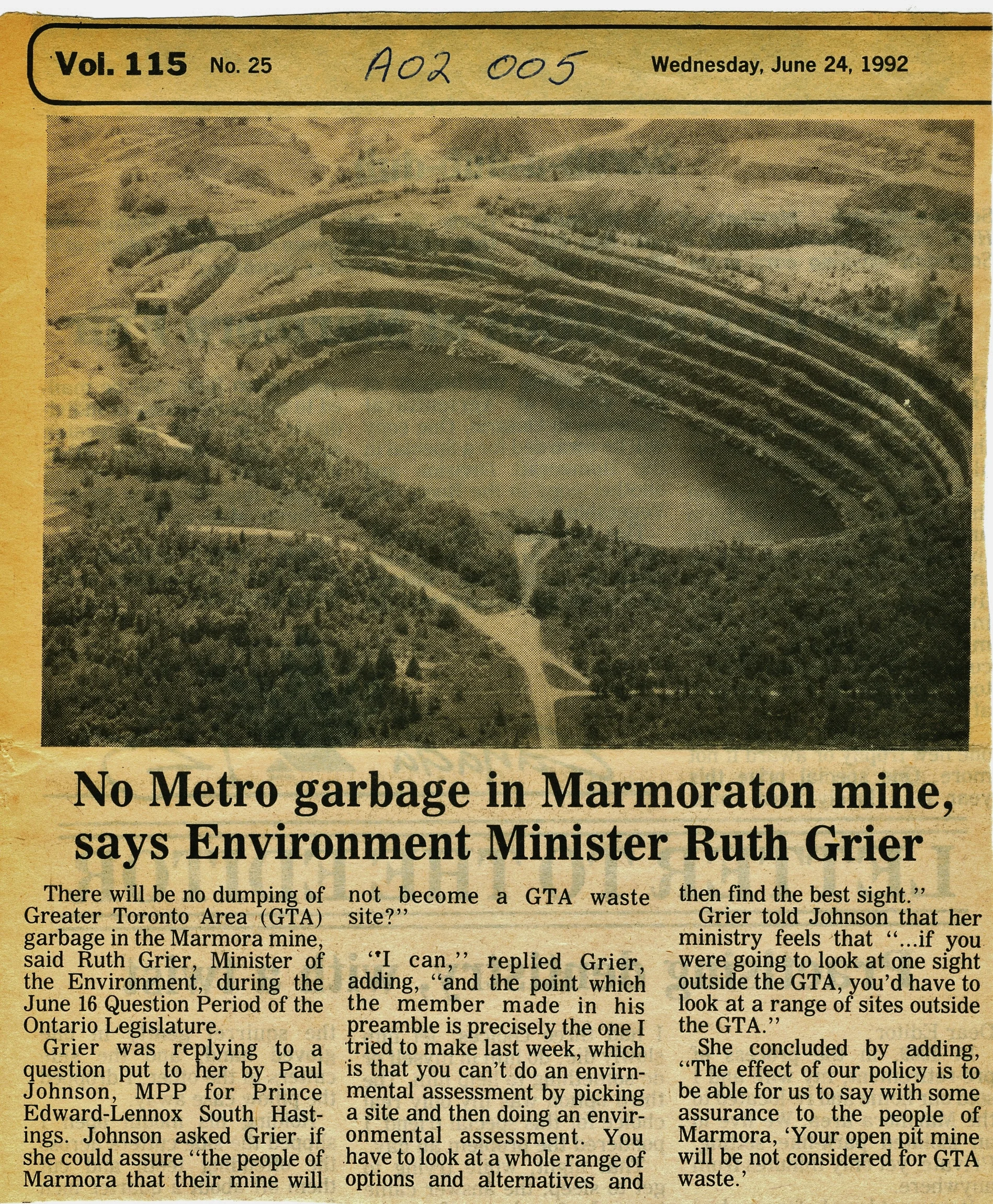 Metro Toronto has a major critical problem-brought about through lack of proper planning to dispose of their waste and must explore sites throughout Ontario to solve their problem. Armbro, the owners of the 2200 acre Marmoraton mine site envisage a grand opportunity to cash in on many millions of dollars if they can get the mine approved as a dump site. They, of course, are doing everything possible to accomplish this.