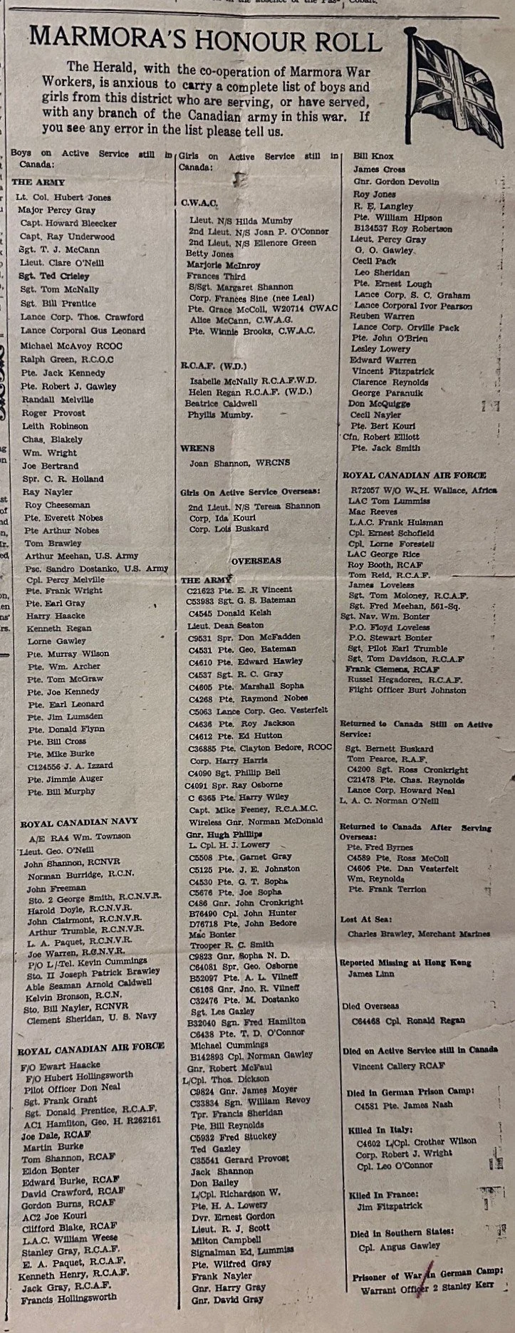 Jay O’Neill sent us this Marmora Harold clipping of Marmora’s Honour Roll (date unknown) He found it in the back of the truck of his father, Clare O’Neill.
