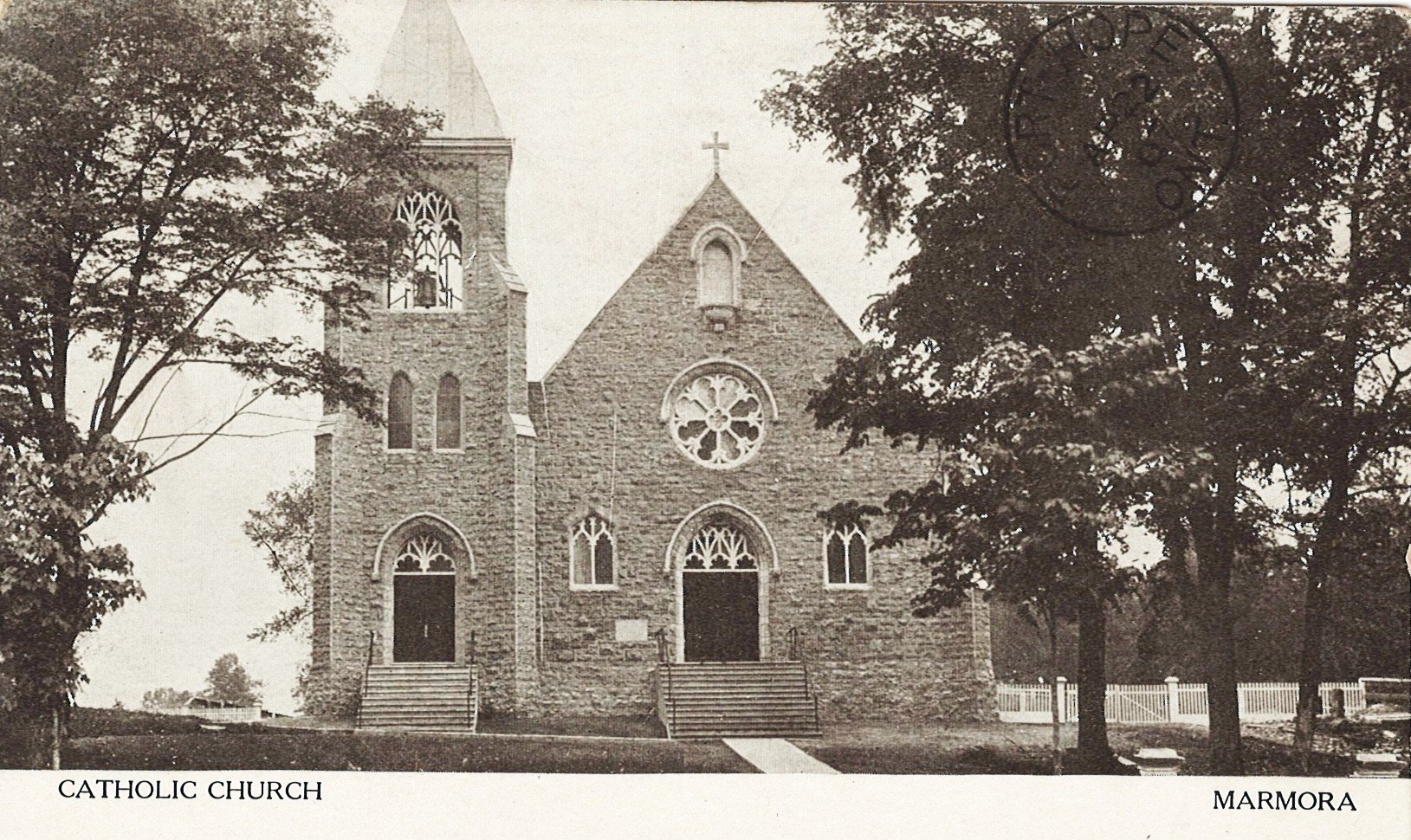 In 1903 the beautiful brick church in Marmora, recently cleared of debt, was hit by lightning and burned with all its contents. In 1904 Father Murtagh directed his courageous flock in building the stone church that now stands. The foundation was built by Richard Sheehy of Peterborough, for $1300; the superstructure by Caspar Speagle of Westport, for $11,460.