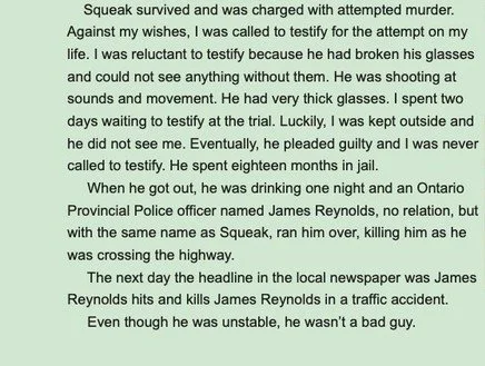 John Croskery: We were headed to the pool hall at the dance intermission. Saw someone at the cash register, thinking it was Leo Provost I knocked on the window. When Squeak turned around with a rifle we took cover.